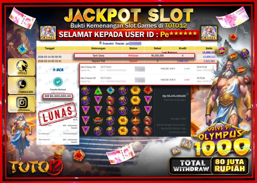Selamat kepada Member Kami Pe****** Telah Jackpot dan berhasil mendapatkan kemenangan besar pada permainan JACKPOT SLOT GAME (GATES OF OLYMPUS 1000) Dengan Kemenangan Sebesar Rp.80.000.000.