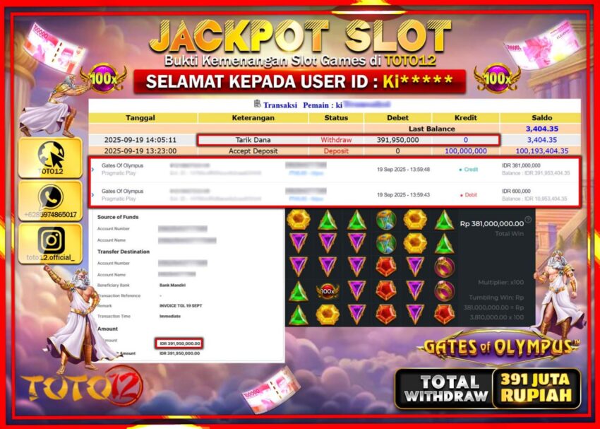 Selamat kepada Member Kami Ki****** Telah Jackpot dan berhasil mendapatkan kemenangan besar pada permainan JACKPOT SLOT GAME (GATES OF OLYMPUS) Dengan Kemenangan Sebesar Rp.391.950.000 –. Setelah mengisi Fomulir Withdraw dengan Kurang waktu 1-2 Menit Dana sudah kami Trasnfer kepada Pemilik Userid dan dana sudah dapat di cairkan oleh pemenang. Bukti Pembayaran yang TOTO12 berikan merupakan Bukti Pembayaran yang SAH / VALID yang langsung Di dapatkan melalui transaksi dari Bank yang di Tunju.
