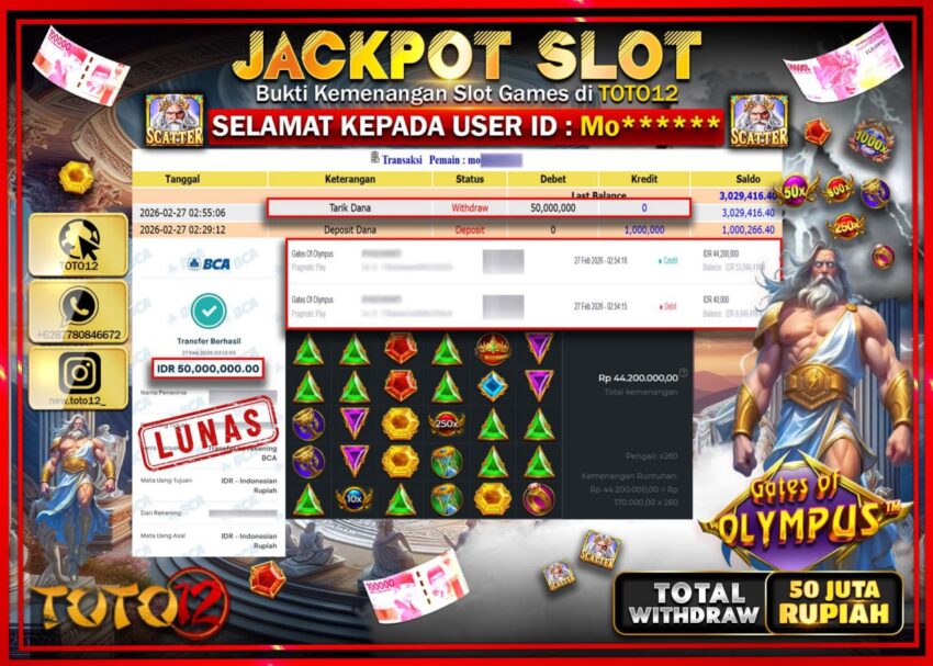 Selamat kepada Member Kami Mo***** Telah Jackpot dan berhasil mendapatkan kemenangan besar pada permainan JACKPOT SLOT GAME (GATES OF OLYMPUS) Dengan Kemenangan Sebesar Rp.50.000.000–.