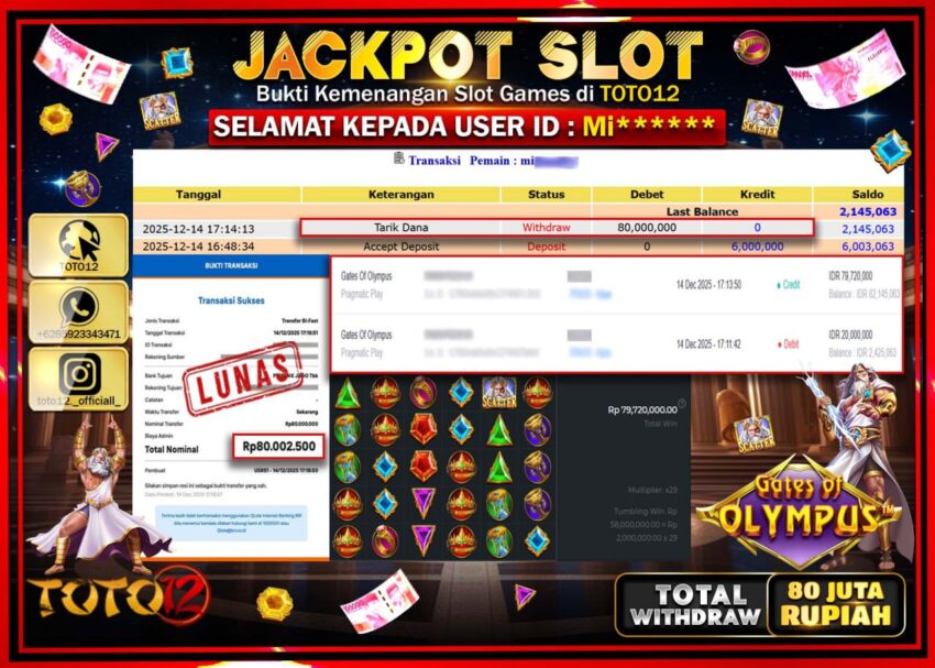 HANYA DI TOTO12 JP PASTI DI BAYAR LUNAS DAN CEPAT!!!!!! JACKPOT SLOT GAME (GATES OF OLYMPUS) Rp.80.000.000 !!!!