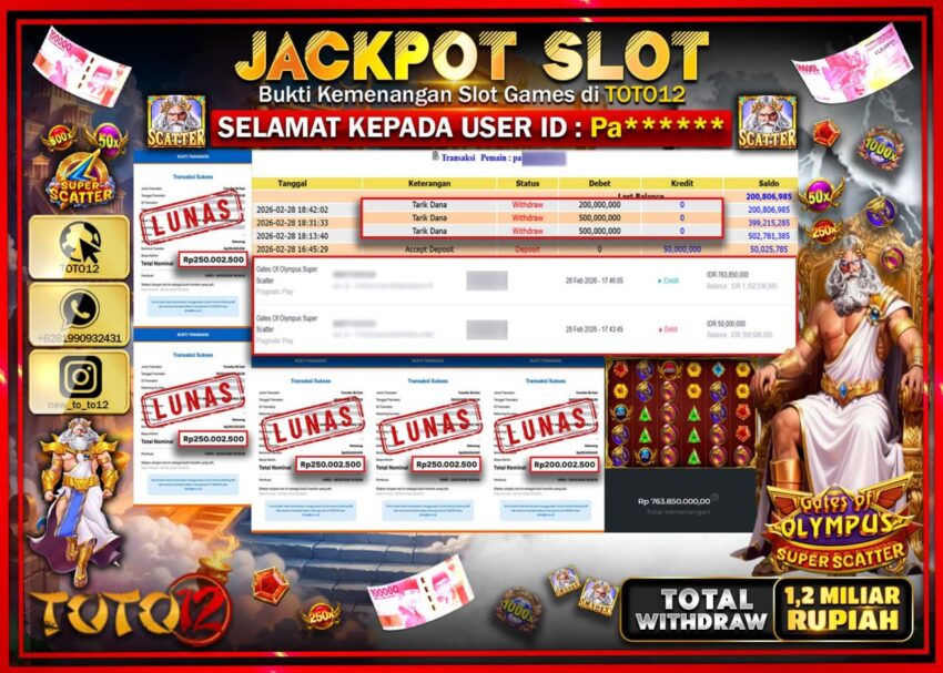 Selamat kepada Member Kami Pa**** Telah Jackpot dan berhasil mendapatkan kemenangan besar pada permainan JACKPOT SLOT GAME (GATES OF OLYMPUS SUPER SCATTER) Dengan Kemenangan Sebesar Rp.1.200.000.000–.