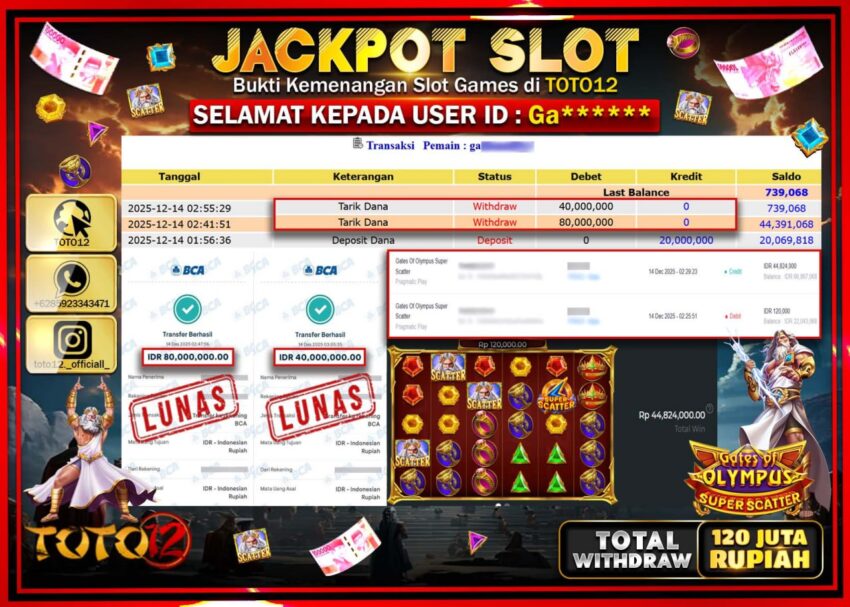 HANYA DI TOTO12 JP PASTI DI BAYAR LUNAS DAN CEPAT!!!!!! JACKPOT SLOT GAME (GATES OF OLYMPUS SUPER SCATTER) Rp.120.000.000 !!!!