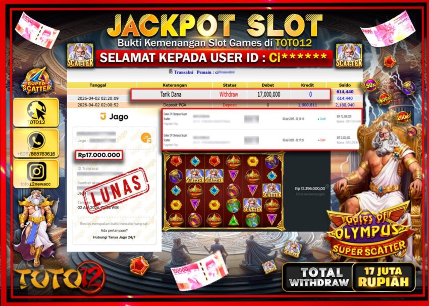 Selamat kepada Member Kami Ci***** Telah Jackpot dan berhasil mendapatkan kemenangan besar pada permainan JACKPOT SLOT GAME (GATES OF OLYMPUS SUPER SCATTER) Dengan Kemenangan Sebesar Rp.17.000.000–.