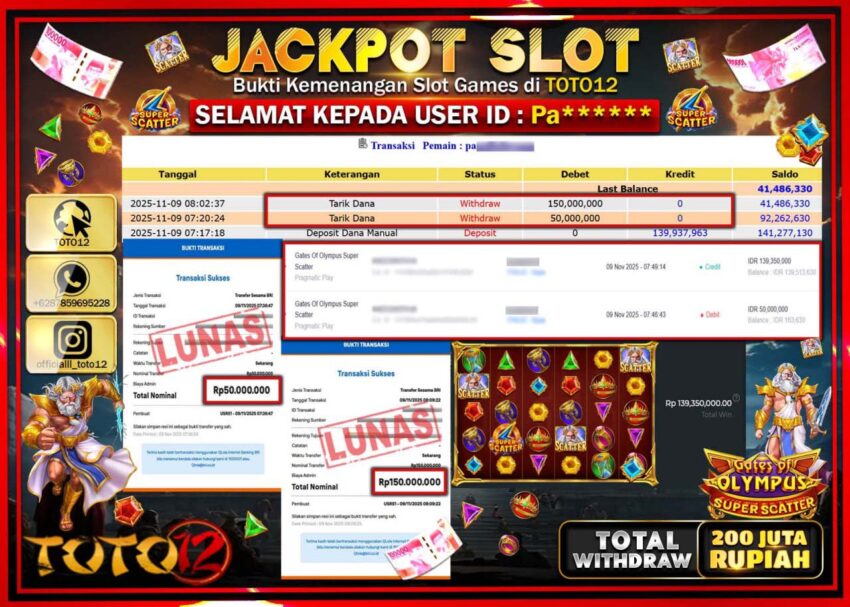 Selamat kepada Member Kami Pa****** Telah Jackpot dan berhasil mendapatkan kemenangan besar pada permainan JACKPOT SLOT GAME (GATES OF OLYMPUS SUPER SCATTER)  Dengan Kemenangan Sebesar Rp.200.000.000 –.  Setelah mengisi Fomulir Withdraw dengan Kurang waktu 1-2 Menit Dana sudah kami Trasnfer kepada Pemilik Userid dan dana sudah dapat di cairkan oleh pemenang. Bukti Pembayaran yang TOTO12 berikan merupakan Bukti Pembayaran yang  SAH / VALID yang langsung Di dapatkan melalui transaksi dari Bank yang di Tunju.