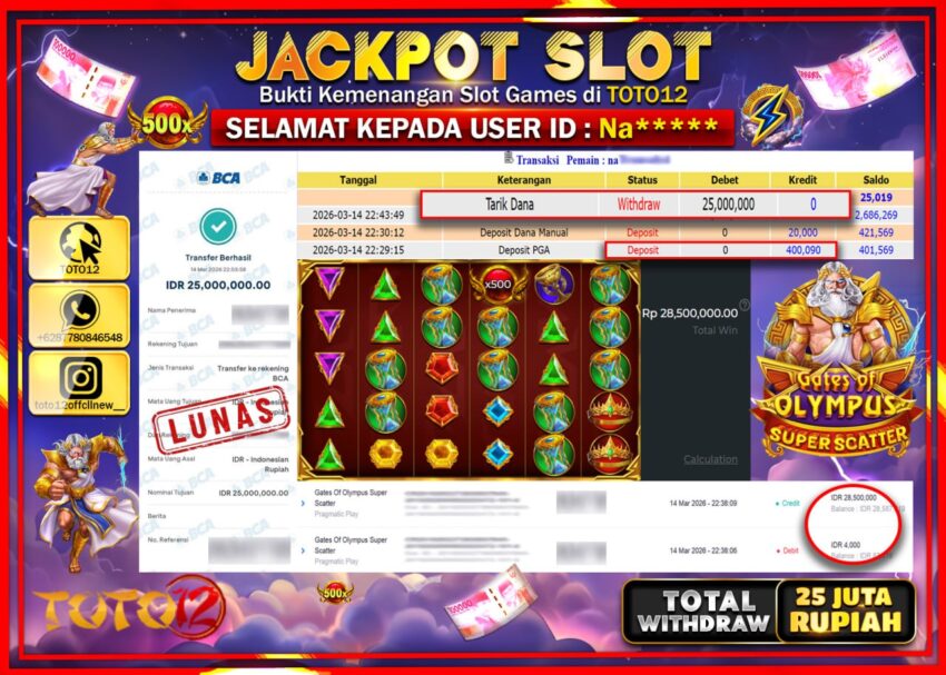 HANYA DI TOTO12 JP PASTI DI BAYAR LUNAS DAN CEPAT!!!!!! JACKPOT SLOT GAME (GATES OF OLYMPUS SUPER SCATTER) Rp.25.000.000!!!!