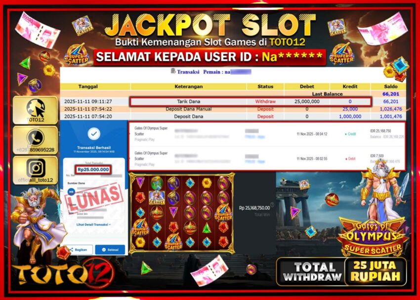 Selamat kepada Member Kami Na****** Telah Jackpot dan berhasil mendapatkan kemenangan besar pada permainan JACKPOT SLOT GAME (GATES OF OLYMPUS SUPER SCATTER)  Dengan Kemenangan Sebesar Rp.25.000.000 –.  Setelah mengisi Fomulir Withdraw dengan Kurang waktu 1-2 Menit Dana sudah kami Trasnfer kepada Pemilik Userid dan dana sudah dapat di cairkan oleh pemenang. Bukti Pembayaran yang TOTO12 berikan merupakan Bukti Pembayaran yang  SAH / VALID yang langsung Di dapatkan melalui transaksi dari Bank yang di Tunju.