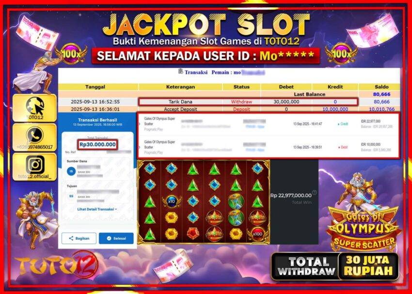 Selamat kepada Member Kami Mo****** Telah Jackpot dan berhasil mendapatkan kemenangan besar pada permainan JACKPOT SLOT GAME (GATES OF OLYMPUS SUPER SCATTER) Dengan Kemenangan Sebesar Rp.30.000.000 –. Setelah mengisi Fomulir Withdraw dengan Kurang waktu 1-2 Menit Dana sudah kami Trasnfer kepada Pemilik Userid dan dana sudah dapat di cairkan oleh pemenang. Bukti Pembayaran yang TOTO12 berikan merupakan Bukti Pembayaran yang SAH / VALID yang langsung Di dapatkan melalui transaksi dari Bank yang di Tunju.