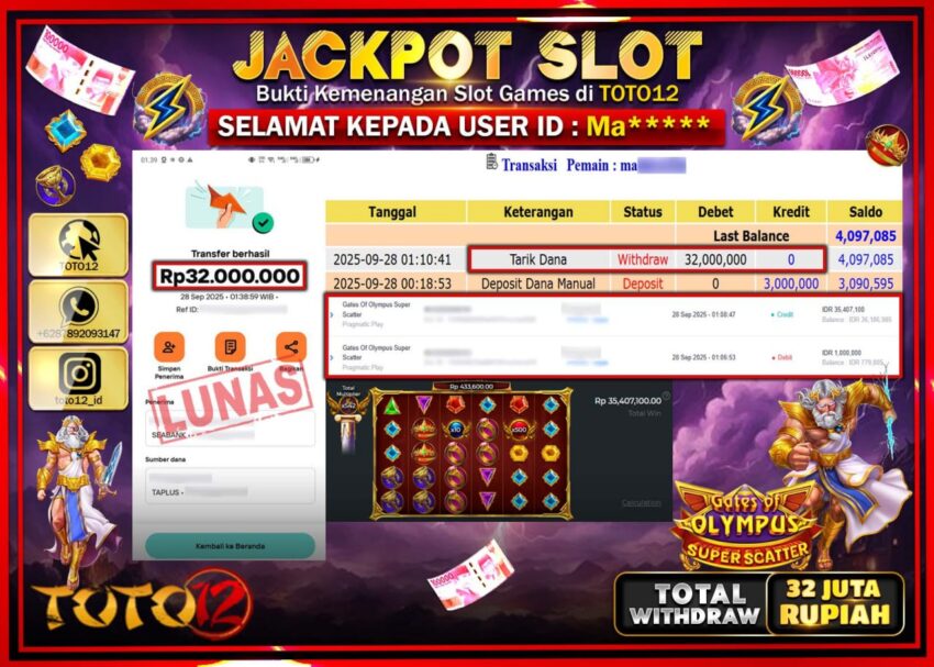 Selamat kepada Member Kami Ma****** Telah Jackpot dan berhasil mendapatkan kemenangan besar pada permainan JACKPOT SLOT GAME (GATES OF OLYMPUS SUPER SCATTER) Dengan Kemenangan Sebesar Rp.32.000.000 –. Setelah mengisi Fomulir Withdraw dengan Kurang waktu 1-2 Menit Dana sudah kami Trasnfer kepada Pemilik Userid dan dana sudah dapat di cairkan oleh pemenang. Bukti Pembayaran yang TOTO12 berikan merupakan Bukti Pembayaran yang SAH / VALID yang langsung Di dapatkan melalui transaksi dari Bank yang di Tunju.