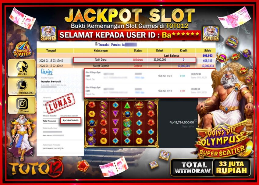 Selamat kepada Member Kami Ba****** Telah Jackpot dan berhasil mendapatkan kemenangan besar pada permainan JACKPOT SLOT GAME (GATES OF OLYMPUS SUPER SCATTER) Dengan Kemenangan Sebesar Rp.33.000.000 –.