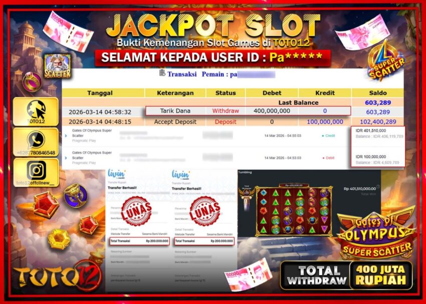 HANYA DI TOTO12 JP PASTI DI BAYAR LUNAS DAN CEPAT!!!!!! JACKPOT SLOT GAME (GATES OF OLYMPUS SUPER SCATTER) Rp.400.000.000!!!!