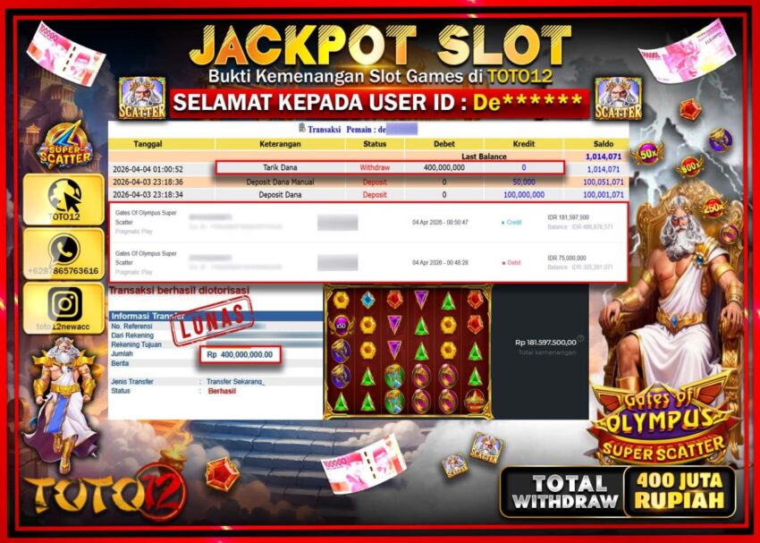 Selamat kepada Member Kami De***** Telah Jackpot dan berhasil mendapatkan kemenangan besar pada permainan JACKPOT SLOT GAME (GATES OF OLYMPUS SUPER SCATTER) Dengan Kemenangan Sebesar Rp.400.000.000–.