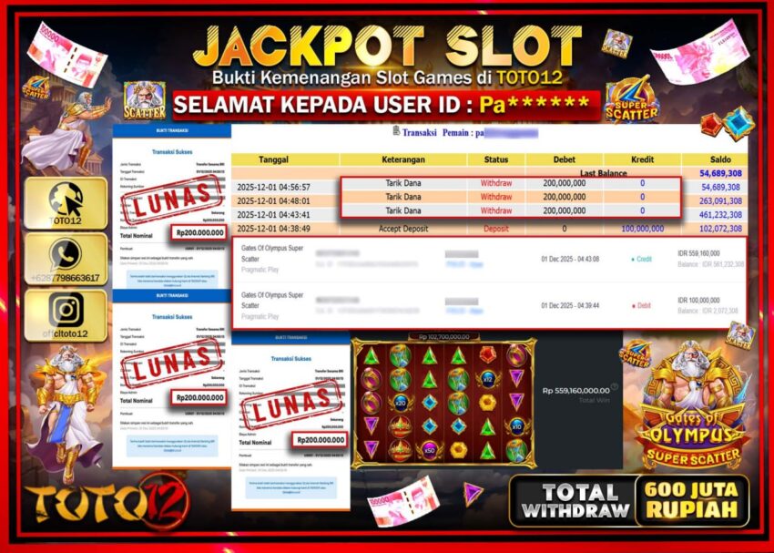 Selamat kepada Member Kami Pa****** Telah Jackpot dan berhasil mendapatkan kemenangan besar pada permainan JACKPOT SLOT GAME (GATES OF OLYMPUS SUPER SCATTER) Dengan Kemenangan Sebesar Rp.600.000.000 –.