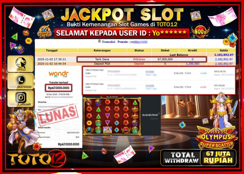 Selamat kepada Member Kami Yo****** Telah Jackpot dan berhasil mendapatkan kemenangan besar pada permainan JACKPOT SLOT GAME (GATES OF OLYMPUS SUPER SCATTER)  Dengan Kemenangan Sebesar Rp.67.000.000 –.  Setelah mengisi Fomulir Withdraw dengan Kurang waktu 1-2 Menit Dana sudah kami Trasnfer kepada Pemilik Userid dan dana sudah dapat di cairkan oleh pemenang. Bukti Pembayaran yang TOTO12 berikan merupakan Bukti Pembayaran yang  SAH / VALID yang langsung Di dapatkan melalui transaksi dari Bank yang di Tunju.