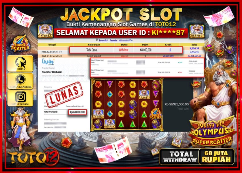 Selamat kepada Member Kami Ki*****87 Telah Jackpot dan berhasil mendapatkan kemenangan besar pada permainan JACKPOT SLOT GAME (GATES OF OLYMPUS SUPER SCATTER) Dengan Kemenangan Sebesar Rp.68.000.000–.