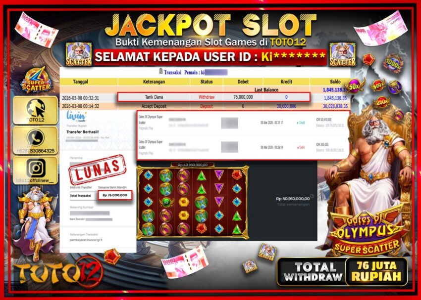 Selamat kepada Member Kami Ki**** Telah Jackpot dan berhasil mendapatkan kemenangan besar pada permainan JACKPOT SLOT GAME (GATES OF OLYMPUS SUPER SCATTER) Dengan Kemenangan Sebesar Rp.76.000.000–.