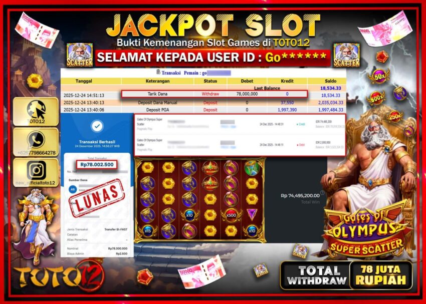 Selamat kepada Member Kami Go****** Telah Jackpot dan berhasil mendapatkan kemenangan besar pada permainan JACKPOT SLOT GAME (GATES OF OLYMPUS SUPER SCATTER) Dengan Kemenangan Sebesar Rp.78.000.000 –.