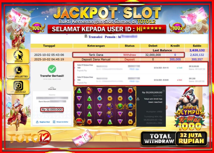 Selamat kepada Member Kami Hi****** Telah Jackpot dan berhasil mendapatkan kemenangan besar pada permainan JACKPOT SLOT GAME (GATES OF OLYMPUS XMAS 1000) Dengan Kemenangan Sebesar Rp.32.000.000 –. Setelah mengisi Fomulir Withdraw dengan Kurang waktu 1-2 Menit Dana sudah kami Trasnfer kepada Pemilik Userid dan dana sudah dapat di cairkan oleh pemenang. Bukti Pembayaran yang TOTO12 berikan merupakan Bukti Pembayaran yang SAH / VALID yang langsung Di dapatkan melalui transaksi dari Bank yang di Tunju.