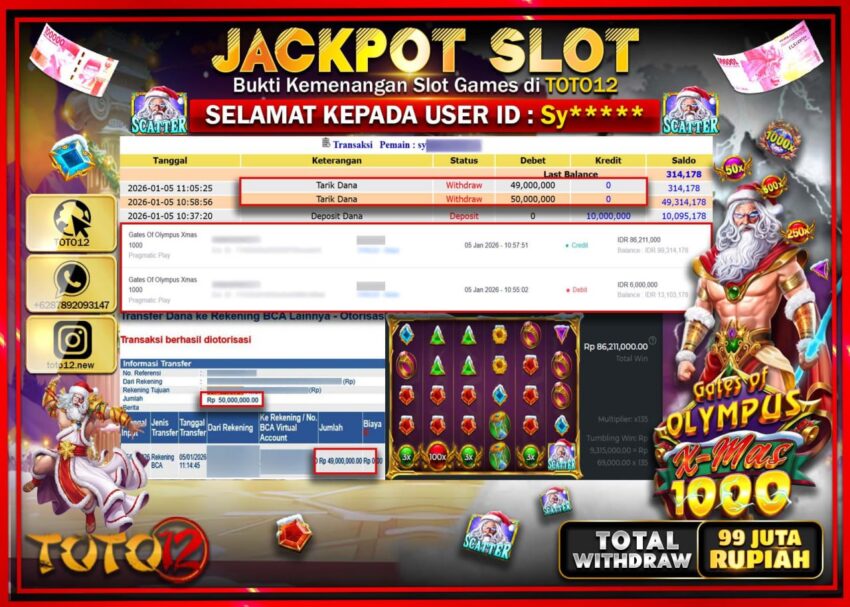 Selamat kepada Member Kami Sy****** Telah Jackpot dan berhasil mendapatkan kemenangan besar pada permainan JACKPOT SLOT GAME (GATES OF OLYMPUS XMAS 1000) Dengan Kemenangan Sebesar Rp.99.000.000 –.