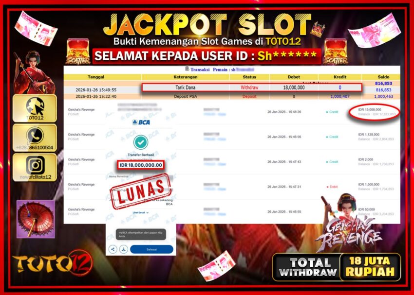 Selamat kepada Member Kami Sh****** Telah Jackpot dan berhasil mendapatkan kemenangan besar pada permainan JACKPOT SLOT GAME (GEISHAS REVENGE) Dengan Kemenangan Sebesar Rp.18.000.000 –.