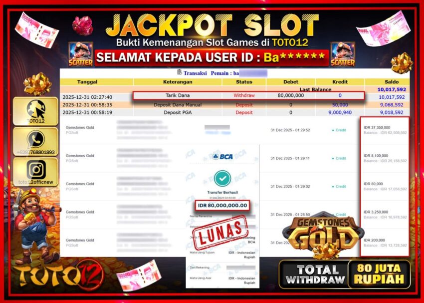 HANYA DI TOTO12 JP PASTI DI BAYAR LUNAS DAN CEPAT!!!!!! JACKPOT SLOT GAME (GEMSTONES GOLD) Rp.80.000.000 !!!!