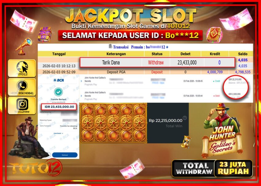 Selamat kepada Member Kami Bo******12 Telah Jackpot dan berhasil mendapatkan kemenangan besar pada permainan JACKPOT SLOT GAME (JOHN HUNTER AND GALILEO’S SECRETS) Dengan Kemenangan Sebesar Rp.23.433.000 –.