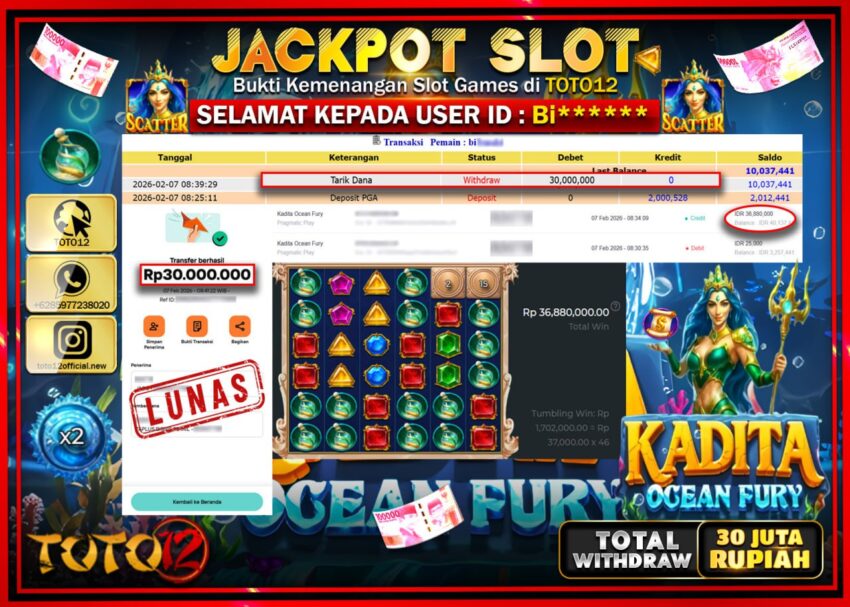 Selamat kepada Member Kami Bi*****Telah Jackpot dan berhasil mendapatkan kemenangan besar pada permainan JACKPOT SLOT GAME (KADITA OCEAN FURY) Dengan Kemenangan Sebesar Rp.30.000.000–.