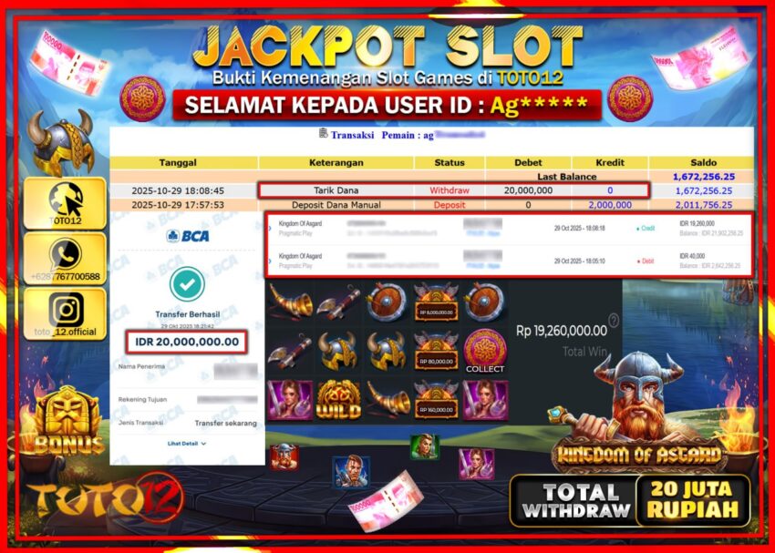 Selamat kepada Member Kami Ag****** Telah Jackpot dan berhasil mendapatkan kemenangan besar pada permainan JACKPOT SLOT GAME (KINGDOM OF ASGARD) Dengan Kemenangan Sebesar Rp.20.000.000 –. Setelah mengisi Fomulir Withdraw dengan Kurang waktu 1-2 Menit Dana sudah kami Trasnfer kepada Pemilik Userid dan dana sudah dapat di cairkan oleh pemenang. Bukti Pembayaran yang TOTO12 berikan merupakan Bukti Pembayaran yang SAH / VALID yang langsung Di dapatkan melalui transaksi dari Bank yang di Tunju.