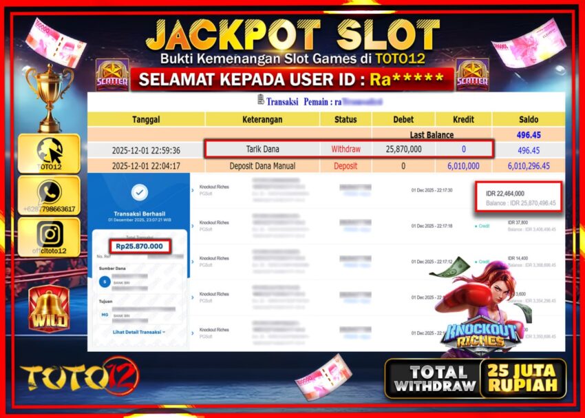 Selamat kepada Member Kami Ra****** Telah Jackpot dan berhasil mendapatkan kemenangan besar pada permainan JACKPOT SLOT GAME (KNOCKOUT RICHES) Dengan Kemenangan Sebesar Rp.25.870.000 –.