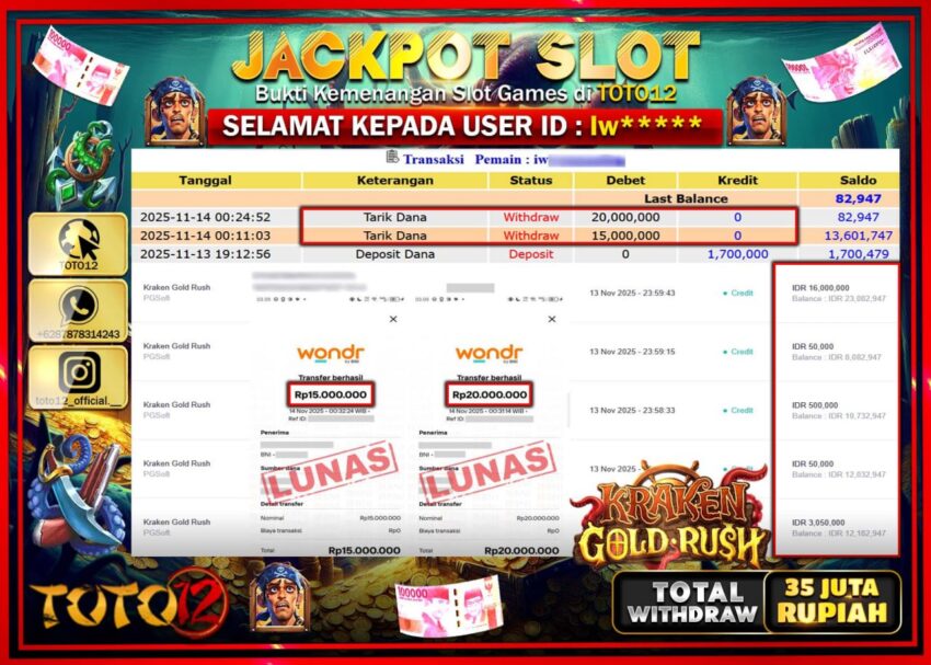Selamat kepada Member Kami Iw****** Telah Jackpot dan berhasil mendapatkan kemenangan besar pada permainan JACKPOT SLOT GAME (KRAKEN GOLD RUSH)  Dengan Kemenangan Sebesar Rp.35.000.000 –.  Setelah mengisi Fomulir Withdraw dengan Kurang waktu 1-2 Menit Dana sudah kami Trasnfer kepada Pemilik Userid dan dana sudah dapat di cairkan oleh pemenang. Bukti Pembayaran yang TOTO12 berikan merupakan Bukti Pembayaran yang  SAH / VALID yang langsung Di dapatkan melalui transaksi dari Bank yang di Tunju.