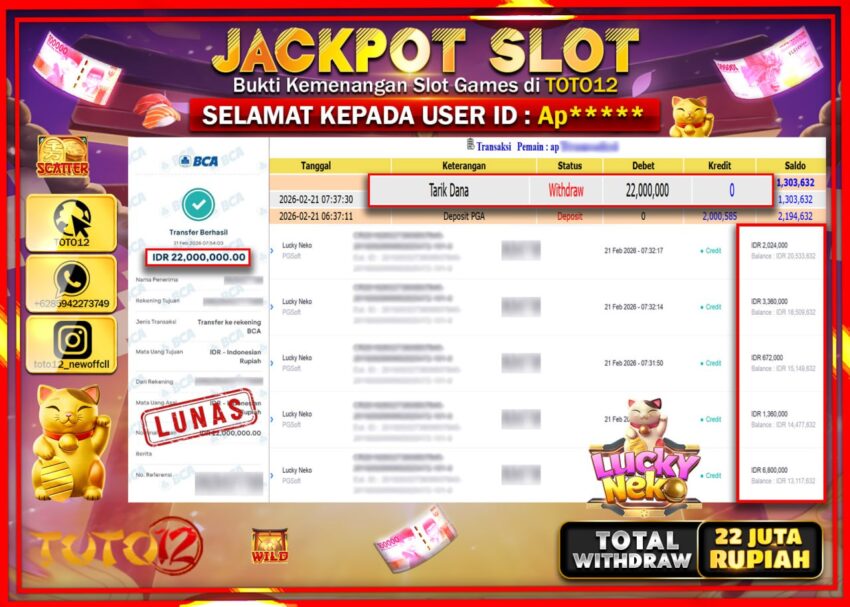 HANYA DI TOTO12 JP PASTI DI BAYAR LUNAS DAN CEPAT!!!!!! JACKPOT SLOT GAME (LUCK NEKO) Rp.22.000.000!!!!