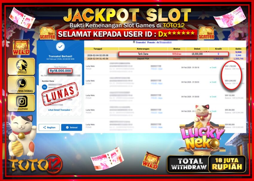 HANYA DI TOTO12 JP PASTI DI BAYAR LUNAS DAN CEPAT!!!!!! JACKPOT SLOT GAME (LUCKY NEKO) Rp.18.000.000 !!!!