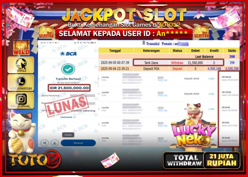 Selamat kepada Member Kami An****** Telah Jackpot dan berhasil mendapatkan kemenangan besar pada permainan JACKPOT SLOT GAME (LUCKY NEKO) Dengan Kemenangan Sebesar Rp.21.500.000 –. Setelah mengisi Fomulir Withdraw dengan Kurang waktu 1-2 Menit Dana sudah kami Trasnfer kepada Pemilik Userid dan dana sudah dapat di cairkan oleh pemenang. Bukti Pembayaran yang TOTO12 berikan merupakan Bukti Pembayaran yang SAH / VALID yang langsung Di dapatkan melalui transaksi dari Bank yang di Tunju.