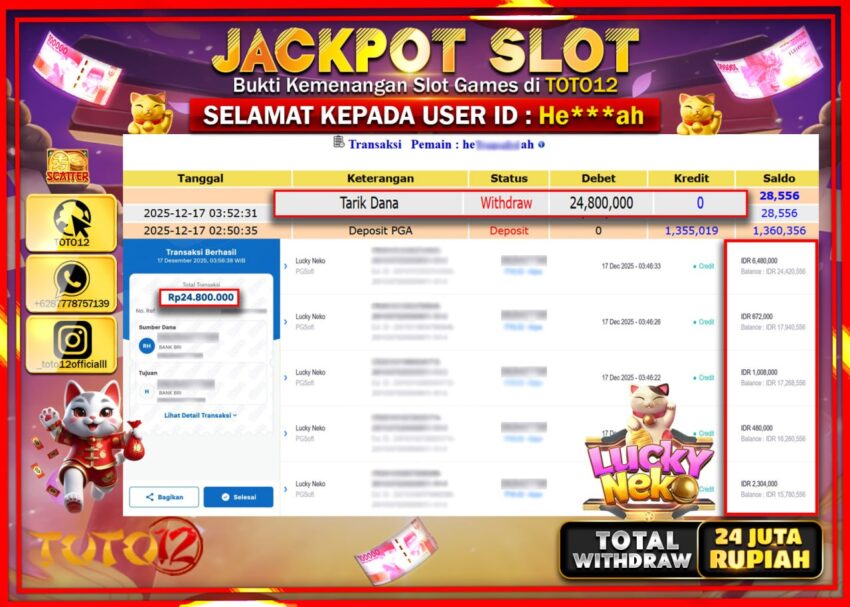 Selamat kepada Member Kami He****** Telah Jackpot dan berhasil mendapatkan kemenangan besar pada permainan JACKPOT SLOT GAME (LUCKY NEKO) Dengan Kemenangan Sebesar Rp.24.800.000 –.