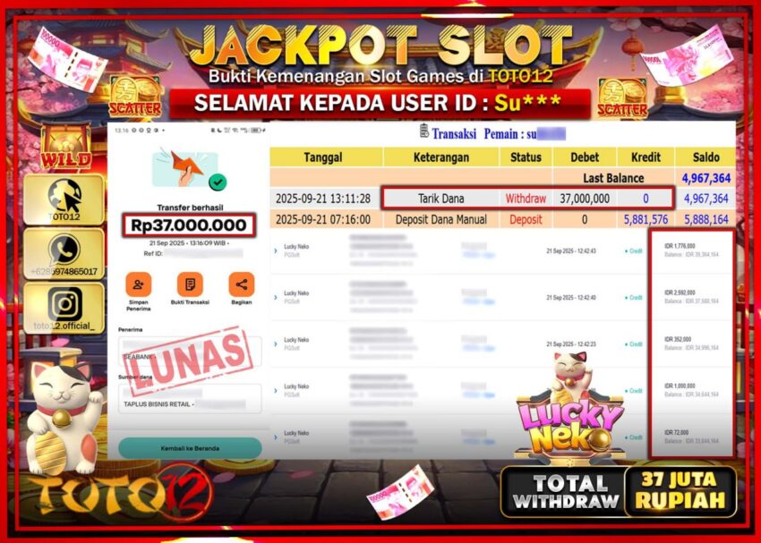 Selamat kepada Member Kami Su****** Telah Jackpot dan berhasil mendapatkan kemenangan besar pada permainan JACKPOT SLOT GAME (LUCKY NEKO) Dengan Kemenangan Sebesar Rp.37.000.000 –. Setelah mengisi Fomulir Withdraw dengan Kurang waktu 1-2 Menit Dana sudah kami Trasnfer kepada Pemilik Userid dan dana sudah dapat di cairkan oleh pemenang. Bukti Pembayaran yang TOTO12 berikan merupakan Bukti Pembayaran yang SAH / VALID yang langsung Di dapatkan melalui transaksi dari Bank yang di Tunju.