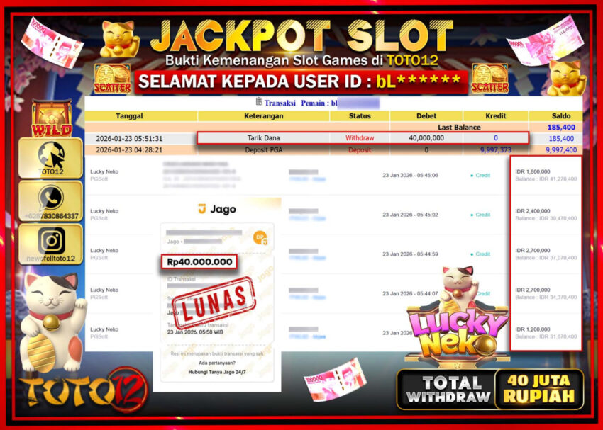 Selamat kepada Member Kami bL****** Telah Jackpot dan berhasil mendapatkan kemenangan besar pada permainan JACKPOT SLOT GAME (LUCKY NEKO) Dengan Kemenangan Sebesar Rp.40.000.000 –.