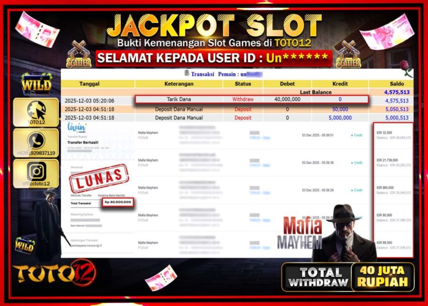 Selamat kepada Member Kami Un****** Telah Jackpot dan berhasil mendapatkan kemenangan besar pada permainan JACKPOT SLOT GAME (MAFIA MAYHEM)  Dengan Kemenangan Sebesar Rp.40.000.000 –.
