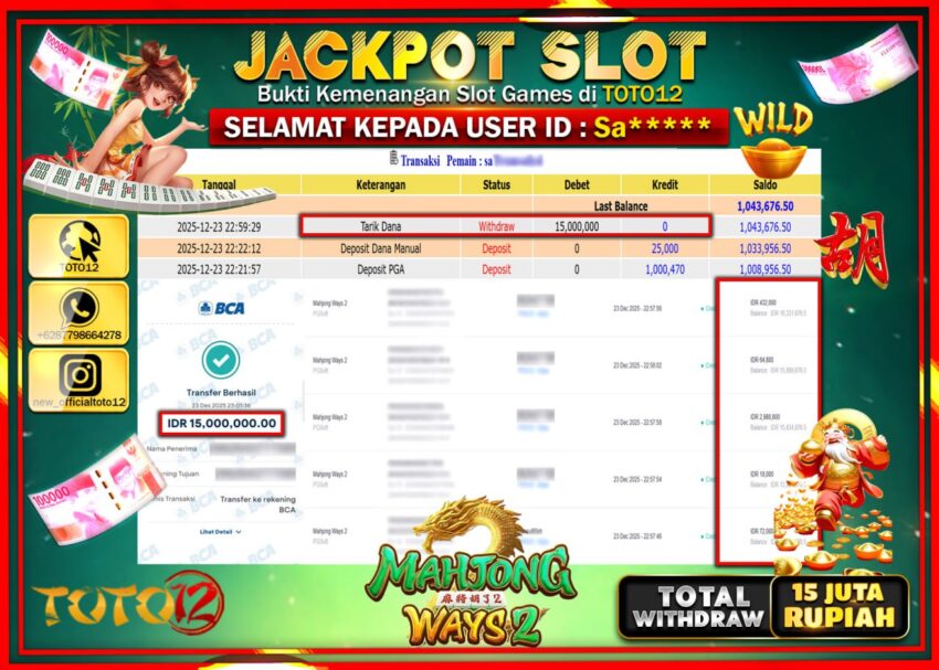 Selamat kepada Member Kami Sa****** Telah Jackpot dan berhasil mendapatkan kemenangan besar pada permainan JACKPOT SLOT GAME (MAHJONG WAYS 2) Dengan Kemenangan Sebesar Rp.15.000.000 –.