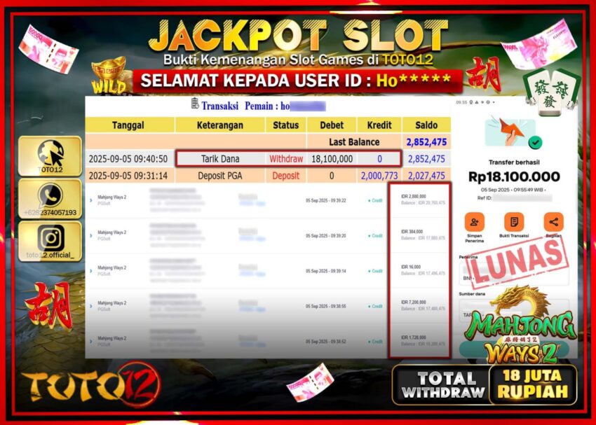 Selamat kepada Member Kami Ho****** Telah Jackpot dan berhasil mendapatkan kemenangan besar pada permainan JACKPOT SLOT GAME (MAHJONG WAYS 2)  Dengan Kemenangan Sebesar Rp.18.100.000 –.  Setelah mengisi Fomulir Withdraw dengan Kurang waktu 1-2 Menit Dana sudah kami Trasnfer kepada Pemilik Userid dan dana sudah dapat di cairkan oleh pemenang. Bukti Pembayaran yang TOTO12 berikan merupakan Bukti Pembayaran yang  SAH / VALID yang langsung Di dapatkan melalui transaksi dari Bank yang di Tunju.