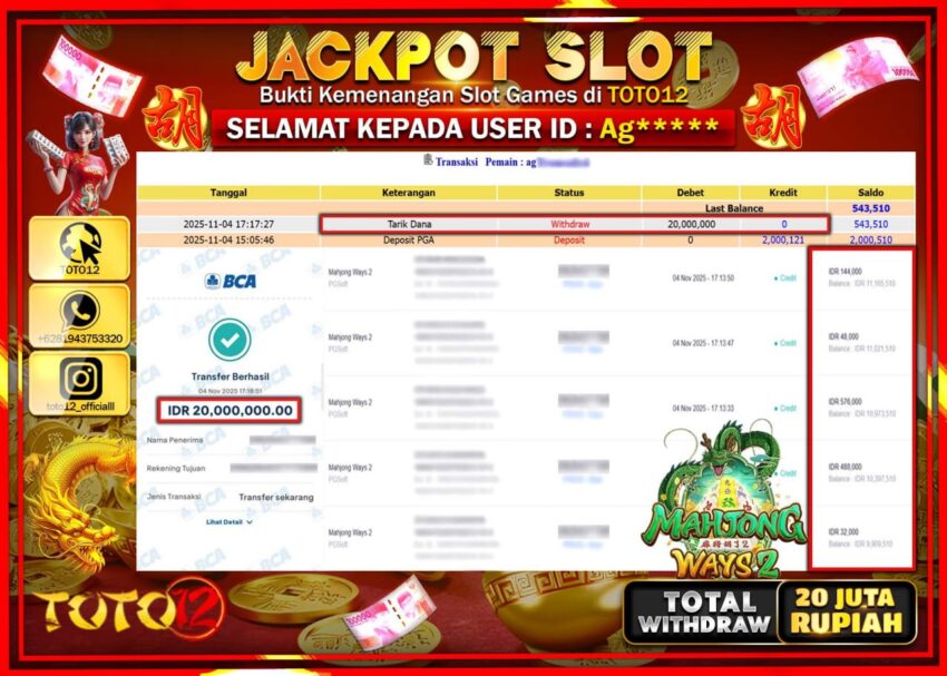 Selamat kepada Member Kami Ag****** Telah Jackpot dan berhasil mendapatkan kemenangan besar pada permainan JACKPOT SLOT GAME (MAHJONG WAYS 2) Dengan Kemenangan Sebesar Rp.20.000.000 –. Setelah mengisi Fomulir Withdraw dengan Kurang waktu 1-2 Menit Dana sudah kami Trasnfer kepada Pemilik Userid dan dana sudah dapat di cairkan oleh pemenang. Bukti Pembayaran yang TOTO12 berikan merupakan Bukti Pembayaran yang SAH / VALID yang langsung Di dapatkan melalui transaksi dari Bank yang di Tunju.