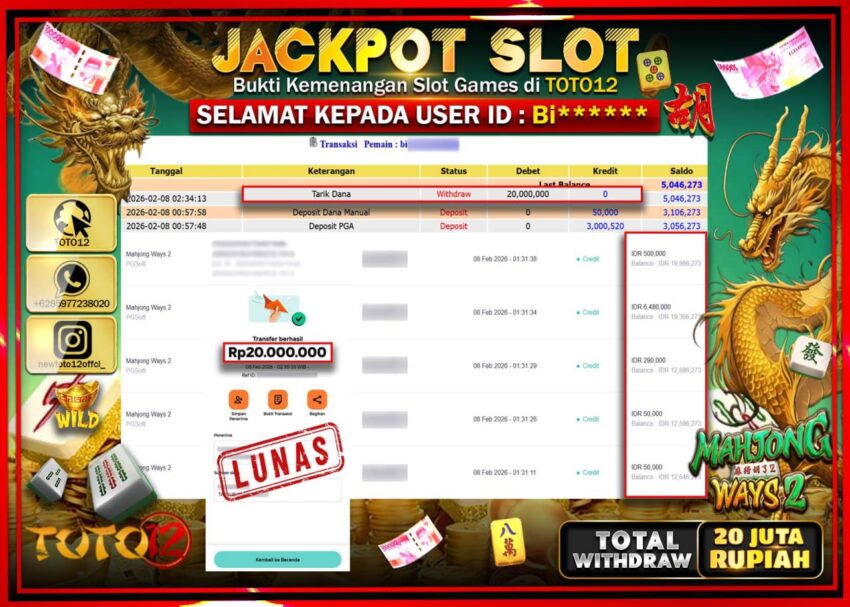 Selamat kepada Member Kami Bi**** Telah Jackpot dan berhasil mendapatkan kemenangan besar pada permainan JACKPOT SLOT GAME  (MAHJONG WAYS 2)  Dengan Kemenangan Sebesar Rp.20.000.000–.