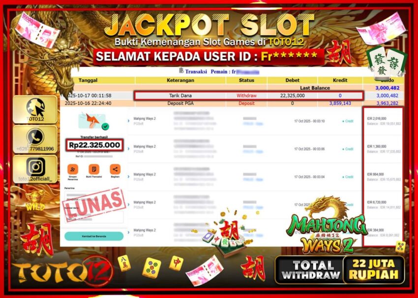 Selamat kepada Member Kami Fr****** Telah Jackpot dan berhasil mendapatkan kemenangan besar pada permainan JACKPOT SLOT GAME (MAHJONG WAYS 2)  Dengan Kemenangan Sebesar Rp.22.325.000 –.  Setelah mengisi Fomulir Withdraw dengan Kurang waktu 1-2 Menit Dana sudah kami Trasnfer kepada Pemilik Userid dan dana sudah dapat di cairkan oleh pemenang. Bukti Pembayaran yang TOTO12 berikan merupakan Bukti Pembayaran yang  SAH / VALID yang langsung Di dapatkan melalui transaksi dari Bank yang di Tunju.