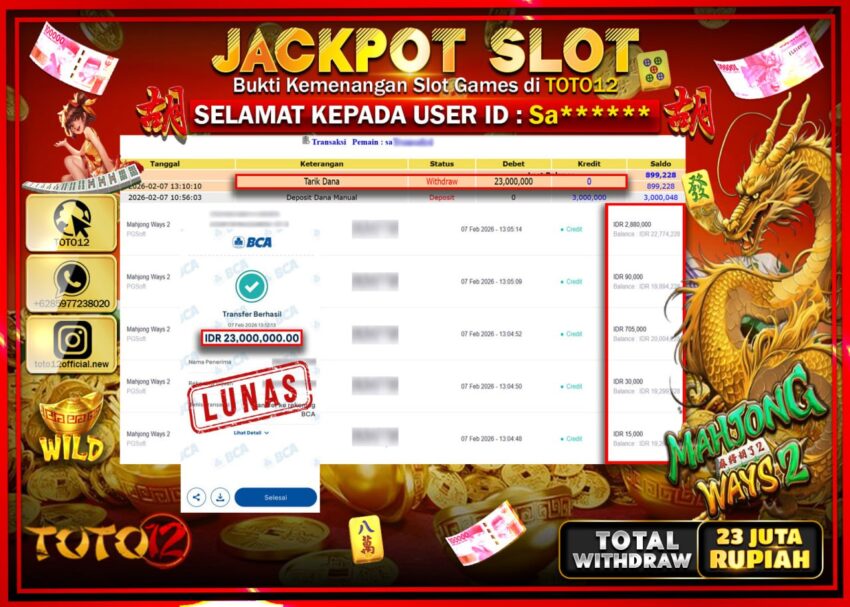 Selamat kepada Member Kami Sa*****Telah Jackpot dan berhasil mendapatkan kemenangan besar pada permainan JACKPOT SLOT GAME (MAHJONG WAYS 2)  Dengan Kemenangan Sebesar Rp.23.000.000–.