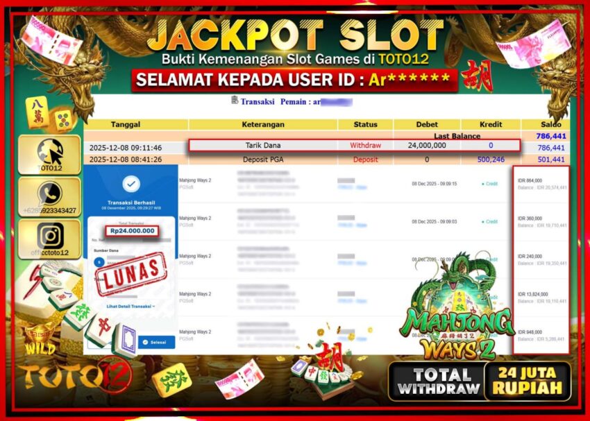 Selamat kepada Member Kami Ar****** Telah Jackpot dan berhasil mendapatkan kemenangan besar pada permainan JACKPOT SLOT GAME (MAHJONG WAYS 2) Dengan Kemenangan Sebesar Rp.24.000.000 –.