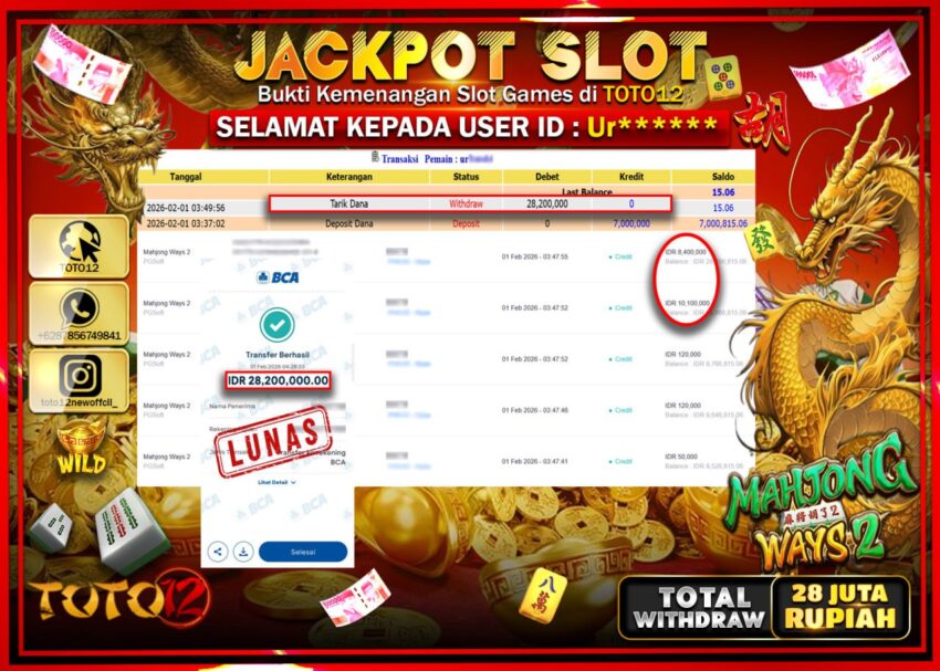 Selamat kepada Member Kami Ur****** Telah Jackpot dan berhasil mendapatkan kemenangan besar pada permainan JACKPOT SLOT GAME (MAHJONG WAYS 2) Dengan Kemenangan Sebesar Rp.28.200.000 –.