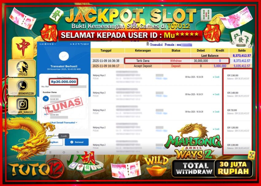Selamat kepada Member Kami Mu****** Telah Jackpot dan berhasil mendapatkan kemenangan besar pada permainan JACKPOT SLOT GAME (MAHJONG WAYS 2) Dengan Kemenangan Sebesar Rp.30.000.000 –. Setelah mengisi Fomulir Withdraw dengan Kurang waktu 1-2 Menit Dana sudah kami Trasnfer kepada Pemilik Userid dan dana sudah dapat di cairkan oleh pemenang. Bukti Pembayaran yang TOTO12 berikan merupakan Bukti Pembayaran yang SAH / VALID yang langsung Di dapatkan melalui transaksi dari Bank yang di Tunju.