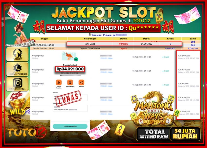 Selamat kepada Member Kami Qu****** Telah Jackpot dan berhasil mendapatkan kemenangan besar pada permainan JACKPOT SLOT GAME (MAHJONG WAYS 2) Dengan Kemenangan Sebesar Rp.34.091.000 –.