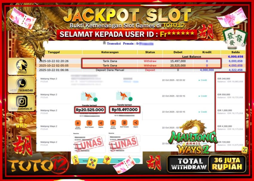 Selamat kepada Member Kami Fr****** Telah Jackpot dan berhasil mendapatkan kemenangan besar pada permainan JACKPOT SLOT GAME (MAHJONG WAYS 2) Dengan Kemenangan Sebesar Rp.36.022.000 –. Setelah mengisi Fomulir Withdraw dengan Kurang waktu 1-2 Menit Dana sudah kami Trasnfer kepada Pemilik Userid dan dana sudah dapat di cairkan oleh pemenang. Bukti Pembayaran yang TOTO12 berikan merupakan Bukti Pembayaran yang SAH / VALID yang langsung Di dapatkan melalui transaksi dari Bank yang di Tunju.