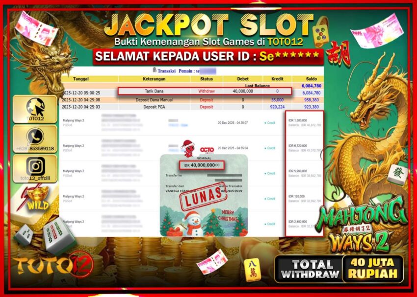 Selamat kepada Member Kami Se****** Telah Jackpot dan berhasil mendapatkan kemenangan besar pada permainan JACKPOT SLOT GAME (MAHJONG WAYS 2) Dengan Kemenangan Sebesar Rp.40.000.000 –.