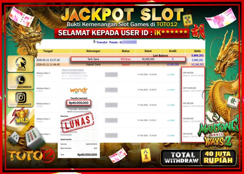 Selamat kepada Member Kami Ik****** Telah Jackpot dan berhasil mendapatkan kemenangan besar pada permainan JACKPOT SLOT GAME (MAHJONG WAYS 2) Dengan Kemenangan Sebesar Rp.40.000.000–.