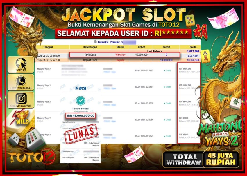 Selamat kepada Member Kami Ri****** Telah Jackpot dan berhasil mendapatkan kemenangan besar pada permainan JACKPOT SLOT GAME (MAHJONG WAYS 2) Dengan Kemenangan Sebesar Rp.45.000.000 –.